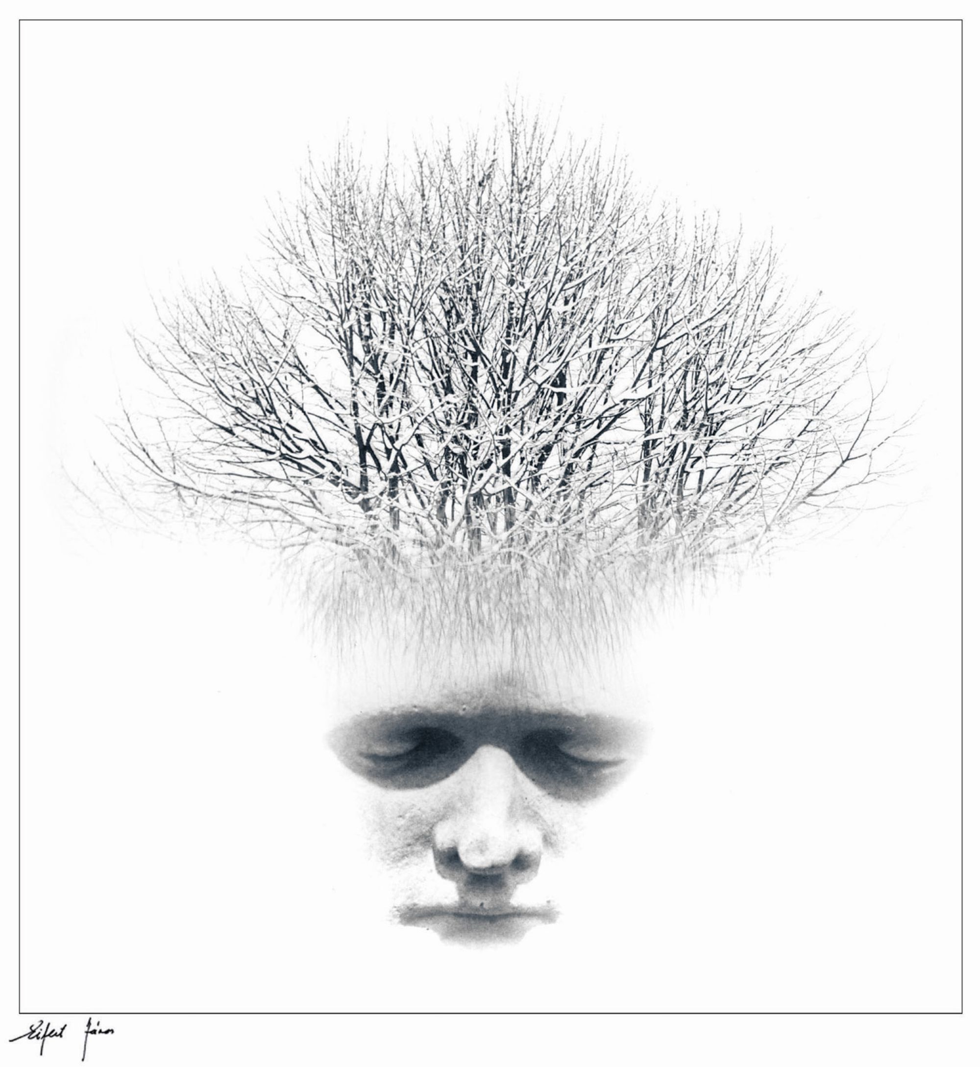Ez a kép, a Föld álma (1984) sokat szerepelt hazai és nemzetközi kiállításokon, többször állították ki, díjazták, publikálták Budapesttől Berlinig, Londontól New Yorkig, mint más képeimet. Montázstechnikával készült, dupla-expozícióval, kézi maszkolással, illetve kitakarással. A két alapfelvétel a nyolcvanas évek elején készült ORWO NP27, illetve Ilford HP4 típusú fekete-fehér negatívra, Pentacon Six 6x6-os és Mamiya 645-ös kamerákkal. Az egyik felvétel a Műcsarnokban, egy nemzetközi kisplasztikai kiállításon készült, Ofa Enstand norvég szobrász művéről, melynek Vadásztrófea (Trophée de chasse) volt a címe. A másik felvétel az Őrségben, Őriszentpéter mellett egy behavazott mezőn álló magányos fát ábrázol. A felvétel pillanatában az objektív elé egy zsebtükör tartottam, megfelelő szögbe forgatva, mintegy Cokin speed előtét működött, és a fa törzsét kitakarva, behavazott koronáját alul kissé életlenül, bemozdulva tükrözte. Az előhívás mindkét esetben Kodak D 76 finomszemcsés, kiegyenlítő hatású negatívhívóban történt. A sötétkamrában a nagyításhoz kiválasztott negatív-kockákról próbacsíkokra expozíciós sorozatot készítettem, hogy a megvilágítási időket pontosan bemérjem, hiszen a kétszer megvilágított papíron a két képelemnek majd egyszerre kell előjönnie, pontosan olyan fedettségben, amelynél a negatív információtartalma az általam meghatározott mértékben jelenik meg. Először a fakorona rávilágítása történt a Forte Bromofort BN5-ös papírra. Nagyítás közben kézzel kifedtem a nem odavaló részeket. Ezután a fotópapírt a hívótálba tettem, csipesszel kicsit mozgatva a folyadékban, hogy ne tapadjon rá buborék, amely világos köröket hagyna maga után. Az első képnyomok előjötte után a stop fürdőben (hideg vizes tálban) megszakítottam a hívás folyamatát. Letöröltem puha ronggyal a vegyszert a papírról, majd újra a nagyítógép alapdeszkájára helyeztem. A másik negatívot a filmtartóba helyezve, vörös szűrőn keresztül beállítottam a kinagyítás mértékét, majd élességet állítottam, rekeszeltem: a második megvilágítás következett. Eközben is a kezemet használtam: a szoborfej bizonyos részeit "hand made" kitakartam, visszatartottam azokat a képrészeket, amelyeket nem akartam megjeleníteni. A "kidekázott" alul világítással a motívumot az eredetihez képest világosabbra hoztam ki. A második megvilágítás után a papír újra az előhívótálba került, majd, amikor megfelelően előjött a végleges kép, megszakítófürdő, fixálás, mosás és szárítás következett. Az apróbb karcokat, a porszem-nyomokat finom ecsetet és Keilitz-festéket használva, pontozó retussal tüntettem el. Az u.n. belső keretet, amely a képet megfelelően lezárja, és nem engedi lebegni a fehér térben, vékony Rotring csőtollal húztam meg. A kézimunka lezárásaként a kész képet szignáltam, címmel és dátummal láttam el, majd digitalizáltam, hogy giclée print készülhessen. (Eifert János)